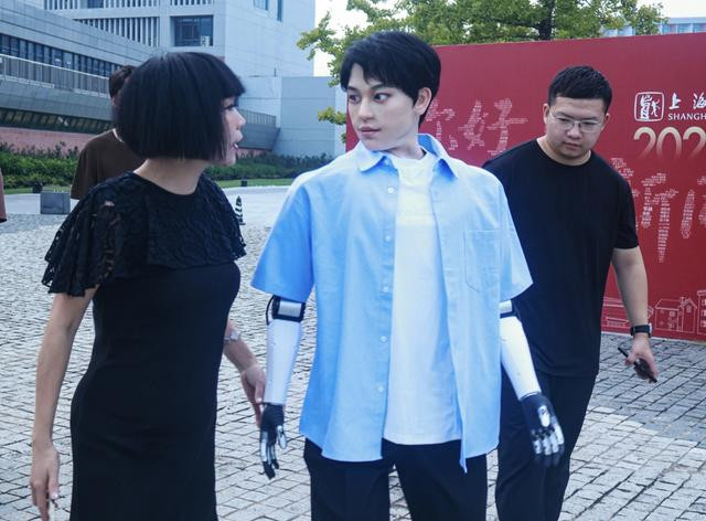 比他(它)高一些的主持人潘涛在教室里与其握手,两人很正式地自我介绍。他的专业大方向与“学霸01”一致,但是师从上戏电影学院副院长、董健教授。杨青青教授有意让“学霸01”穿短袖衬衫——露出了机械臂。故而潘涛并没有“完全进入角色”,而是一边与这位新同学握手,一边如主持人一般向旁人介绍这位新同学,所以会忍不住感慨道:“没想到具身机器人的发展这么迅速!”此时还与潘涛握着手的“学霸01”已经“侦测”到潘涛潜意识里视其为机器人,就接话道:“我不是机器人,我是博士生哦!”众人忍俊不禁。