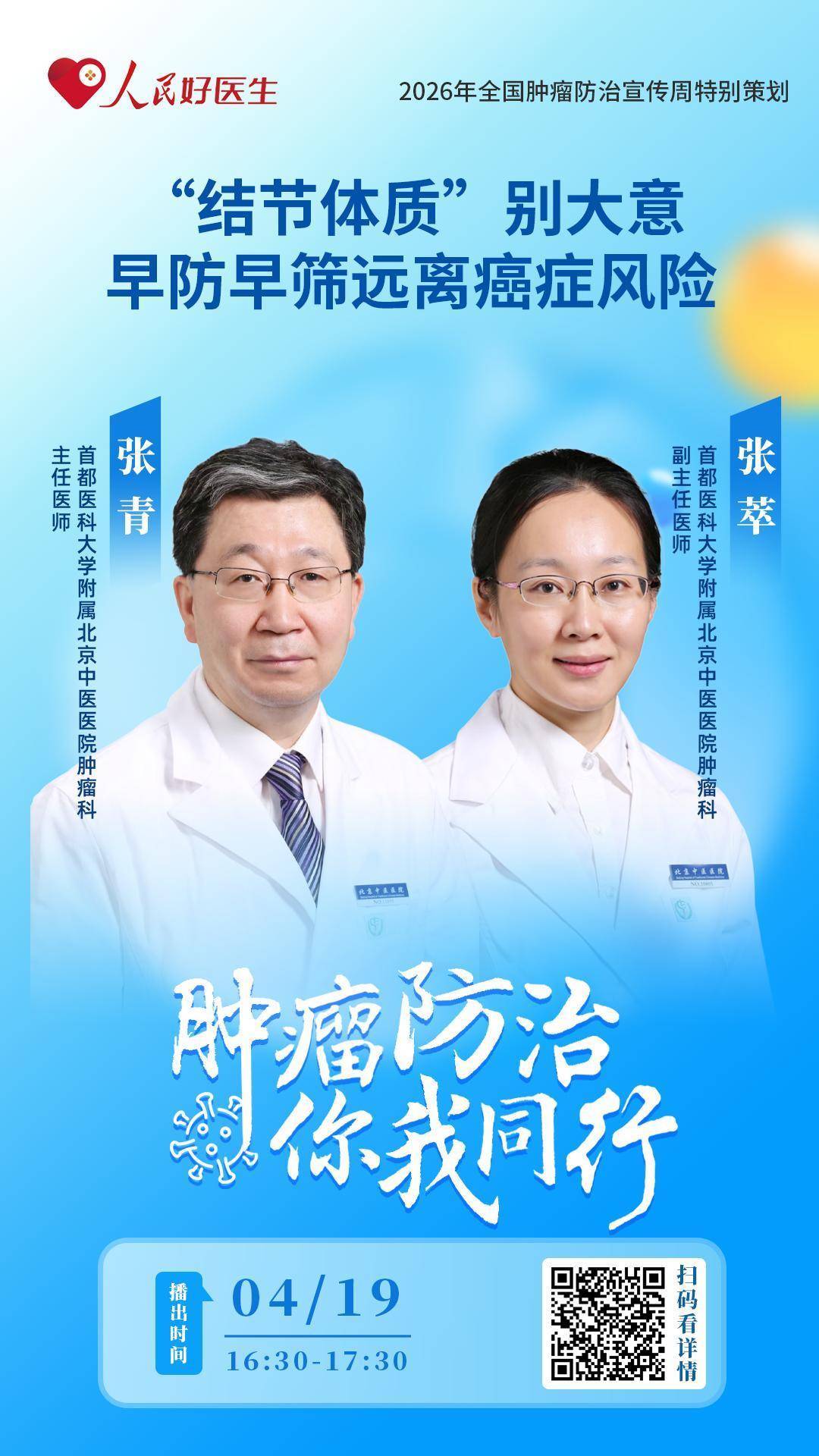 4月19日16:30至17:30,首都医科大学附属北京中医医院肿瘤科主任医师张青、首都医科大学附属北京中医医院肿瘤科副主任医师张萃将做客“人民好医生”客户端直播间,与大家分享癌症防治、饮食调养等相关内容。