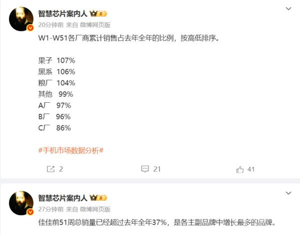 值得一提的是,该博主还特别指出,一加手机在今年前51周的总销量已经超过去年全年37%,成为各主副品牌中增长最多的品牌。